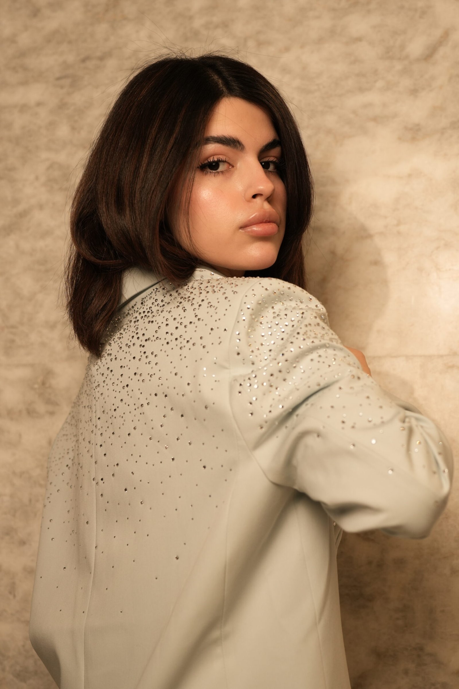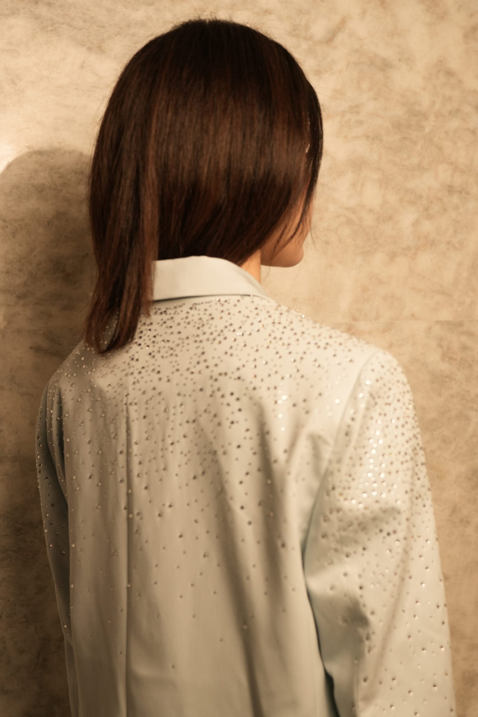 A refined blue blazer accented with strass details for a sophisticated statement.