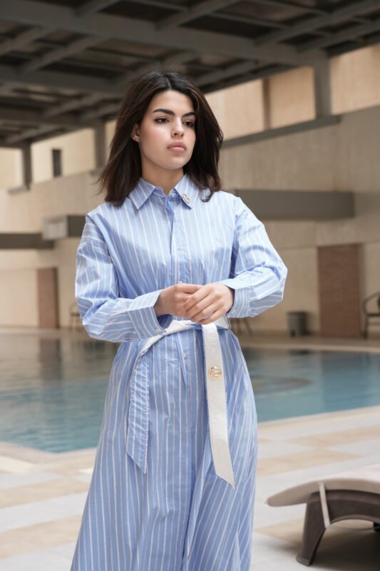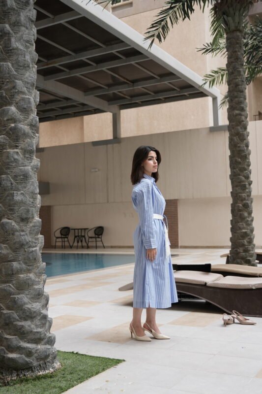This pleated midi dress moves beautifully with every step, while the red belt defines the waist for a feminine silhouette