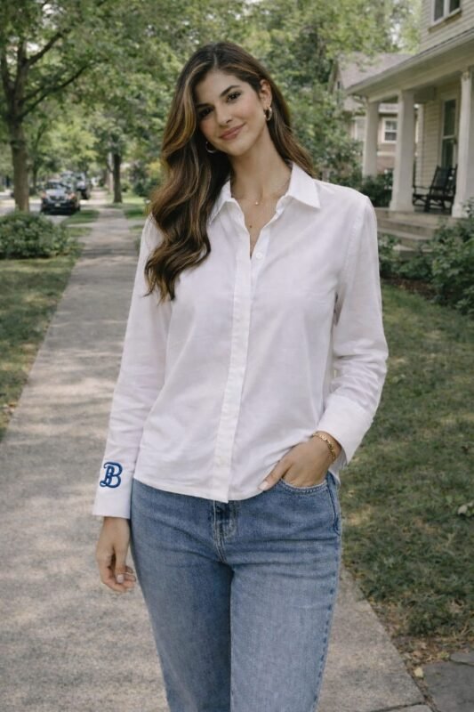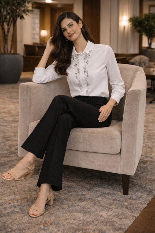 This blue popelin shirt combines timeless tailoring with refined sparkle. The strass detailing adds a subtle statement, making it perfect for chic office looks or evening styling.